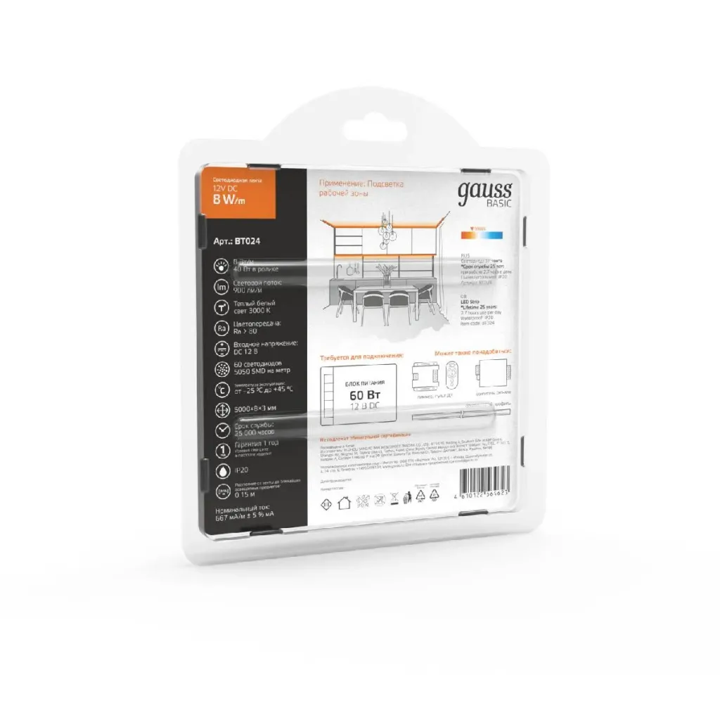 Светодиодная лента Gauss Basic 12В 2835 9,6Вт/м 3000K 5м IP20 BT064