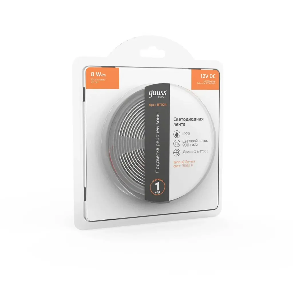 Светодиодная лента Gauss Basic 12В 5050 8Вт/м 3000K 3м IP20 BT022