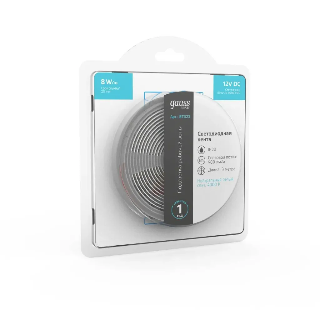 Светодиодная лента Gauss Basic 12В 5050 8Вт/м 4000K 5м IP20 BT025