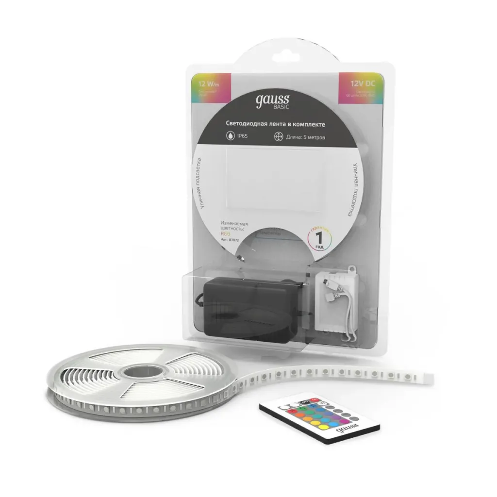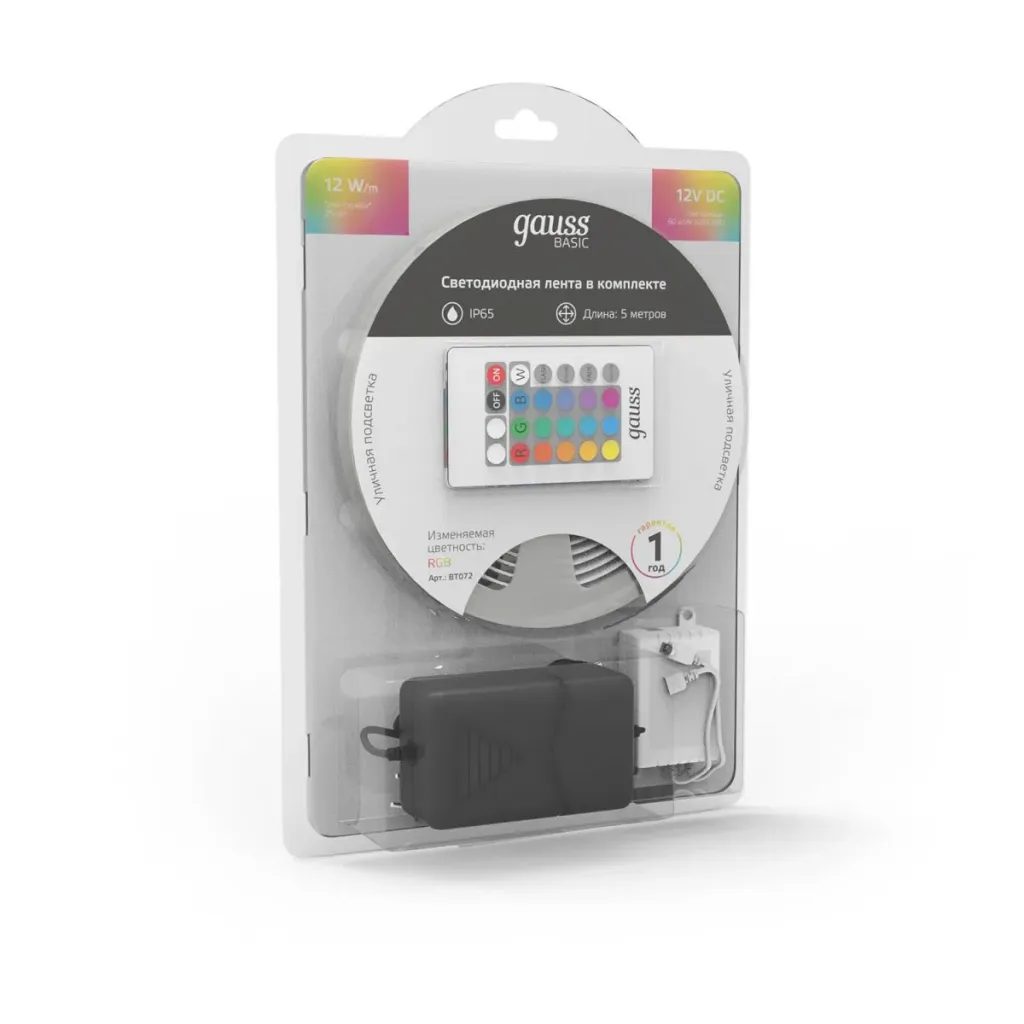 Светодиодная лента Gauss Basic 12В 5050 12Вт/м RGB 5м IP65 BT072