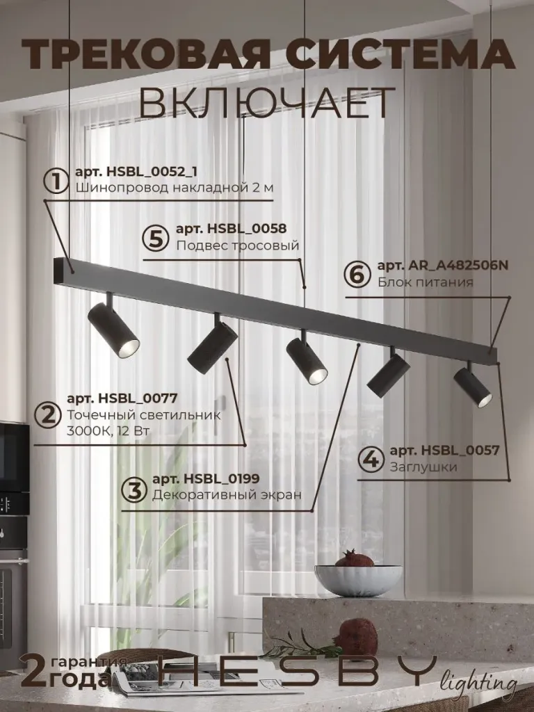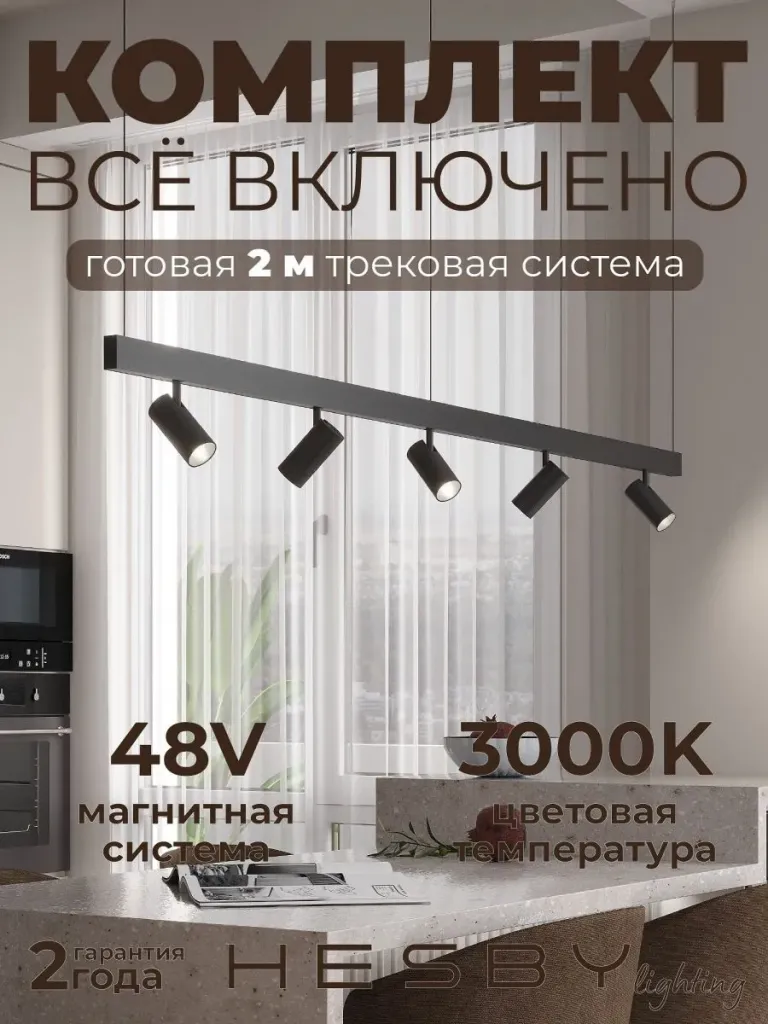 Трековая система со светильниками №3 трехфазная подвесная Eldeko (48В, форма - прямая, 2м, 3000K) черная Hesby Lighting HSBL_kompl_E003_PI2B3K