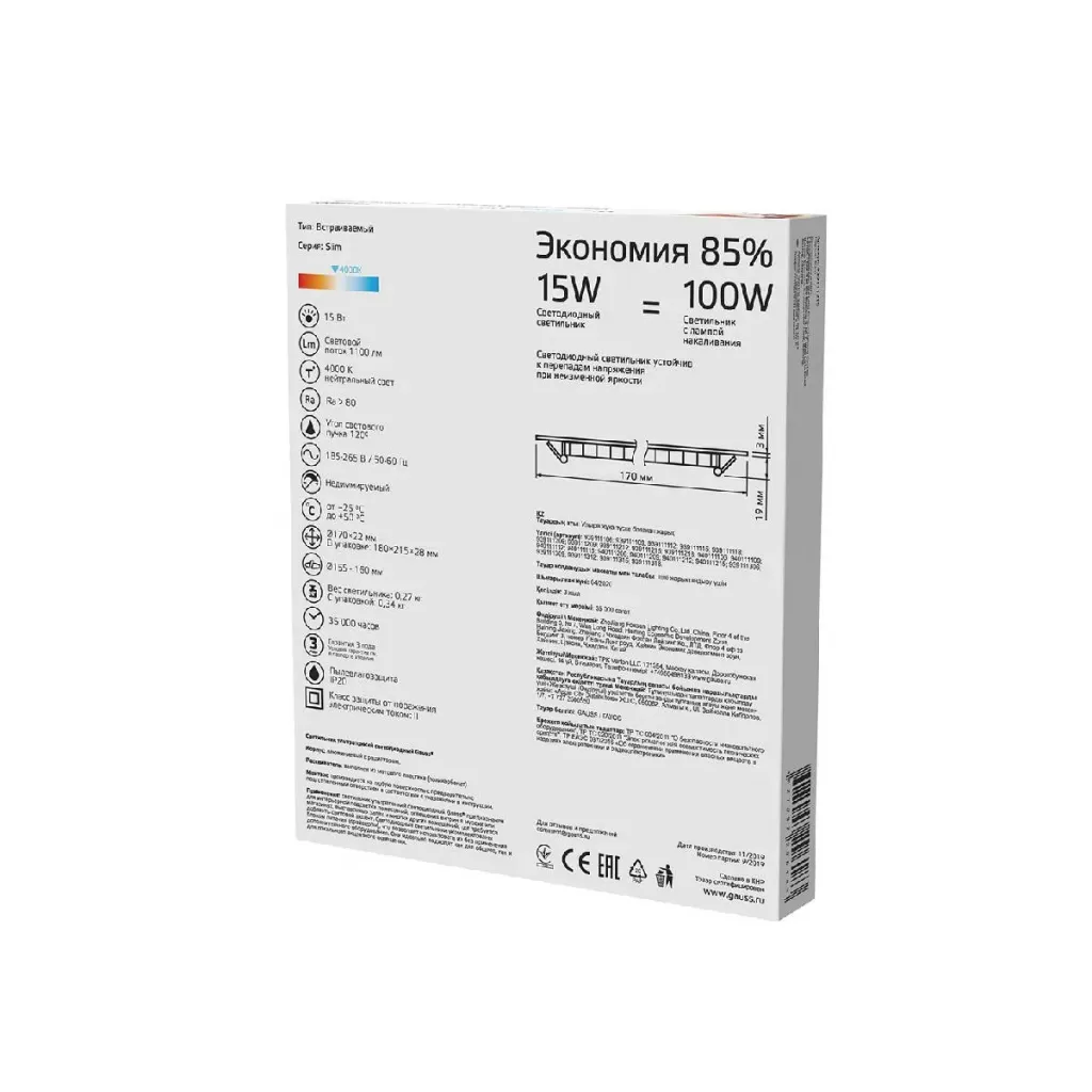 Встраиваемый светодиодный светильник Gauss 939111215