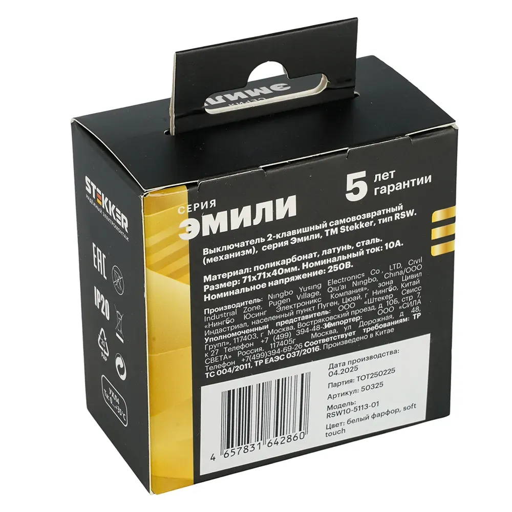 Выключатель 2-клавишный самовозвратный (механизм) Stekker Эмили 250В 10А RSW10-5113-01 белый фарфор soft touch 50325