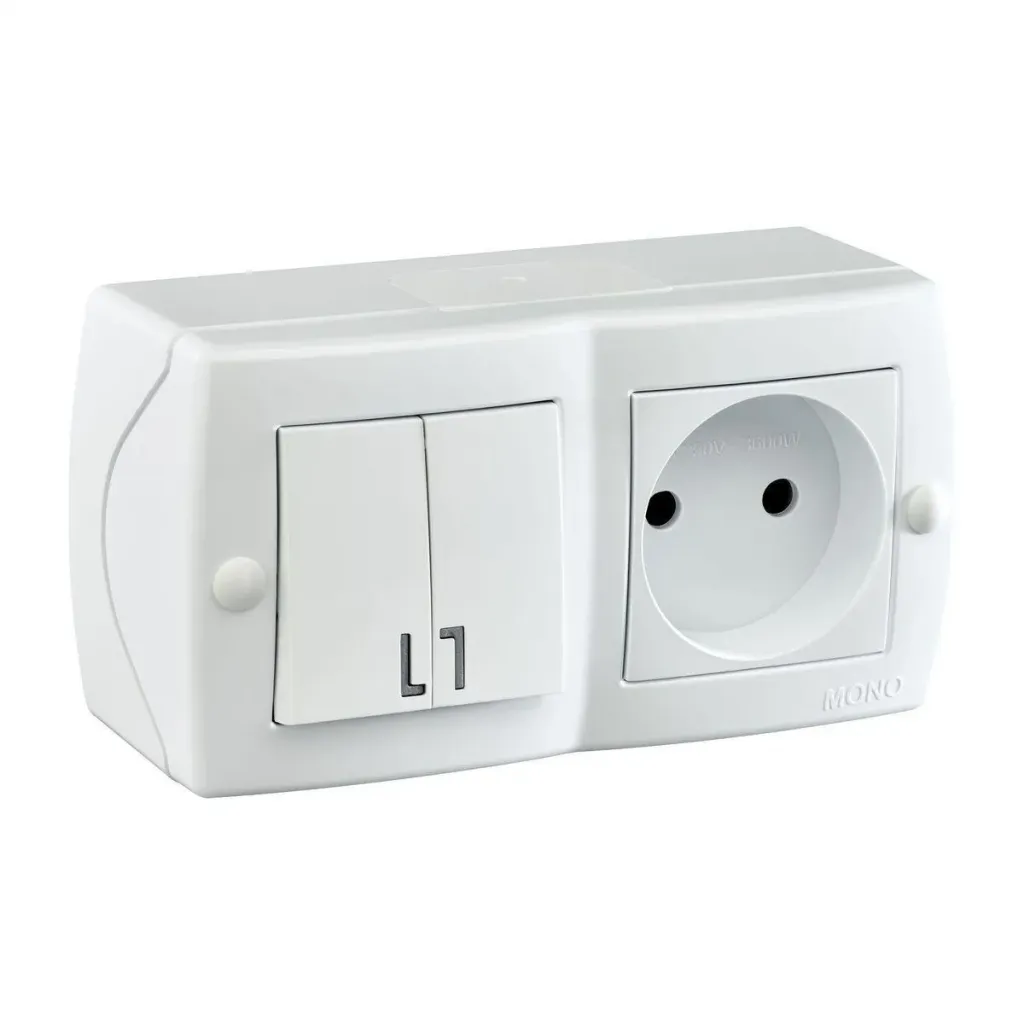 Выключатель двухклавишный + розетка с заземлением и крышкой Mono Electric Octans IP20 10А 250В белый 104-010101-187